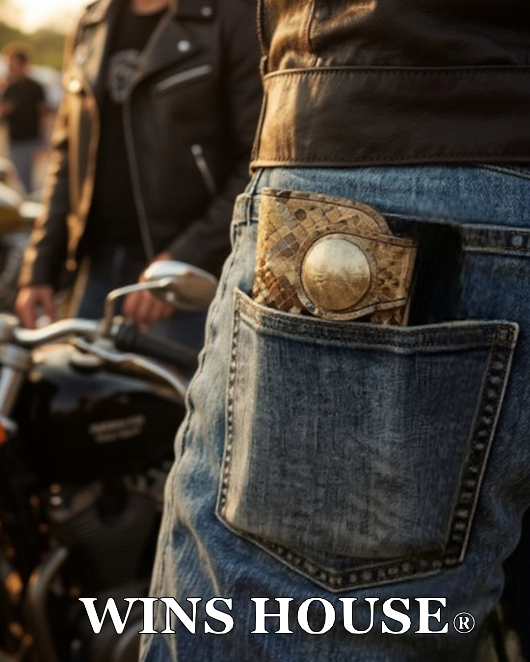 耐久性にもこだわり、内装もオールレザー仕様(牛革)。迫力のあるアメリカ製オールドコイン1ドルをコンチョにし、男らしい蛇革財布をお探しの方におすすめ。